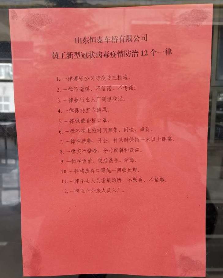 众志成城,共同抗“疫”。进入2020年,突如其来的新冠疫情对经济发展和人民生活造成了巨大影响。为有效应对疫情,阻断扩散,恒泰车桥有限公司紧紧围绕上级疫情防控指示精神,动员广大党员干部深入“前线”,从入厂监测、就餐洗浴、厂区消杀等多个环节入手,通过严格的举措和扎实的努力,为企业构筑了铜墙铁壁,守护了一方安宁!