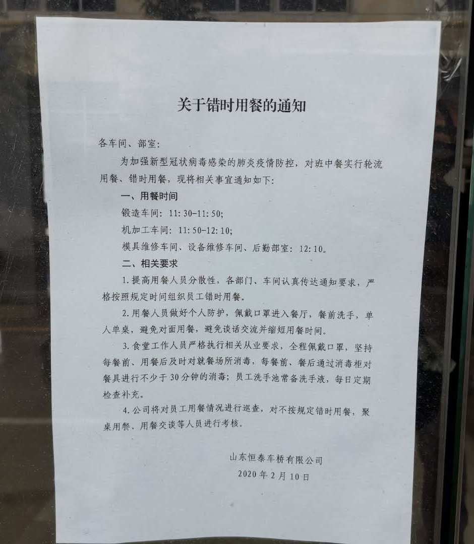 众志成城,共同抗“疫”。进入2020年,突如其来的新冠疫情对经济发展和人民生活造成了巨大影响。为有效应对疫情,阻断扩散,恒泰车桥有限公司紧紧围绕上级疫情防控指示精神,动员广大党员干部深入“前线”,从入厂监测、就餐洗浴、厂区消杀等多个环节入手,通过严格的举措和扎实的努力,为企业构筑了铜墙铁壁,守护了一方安宁!